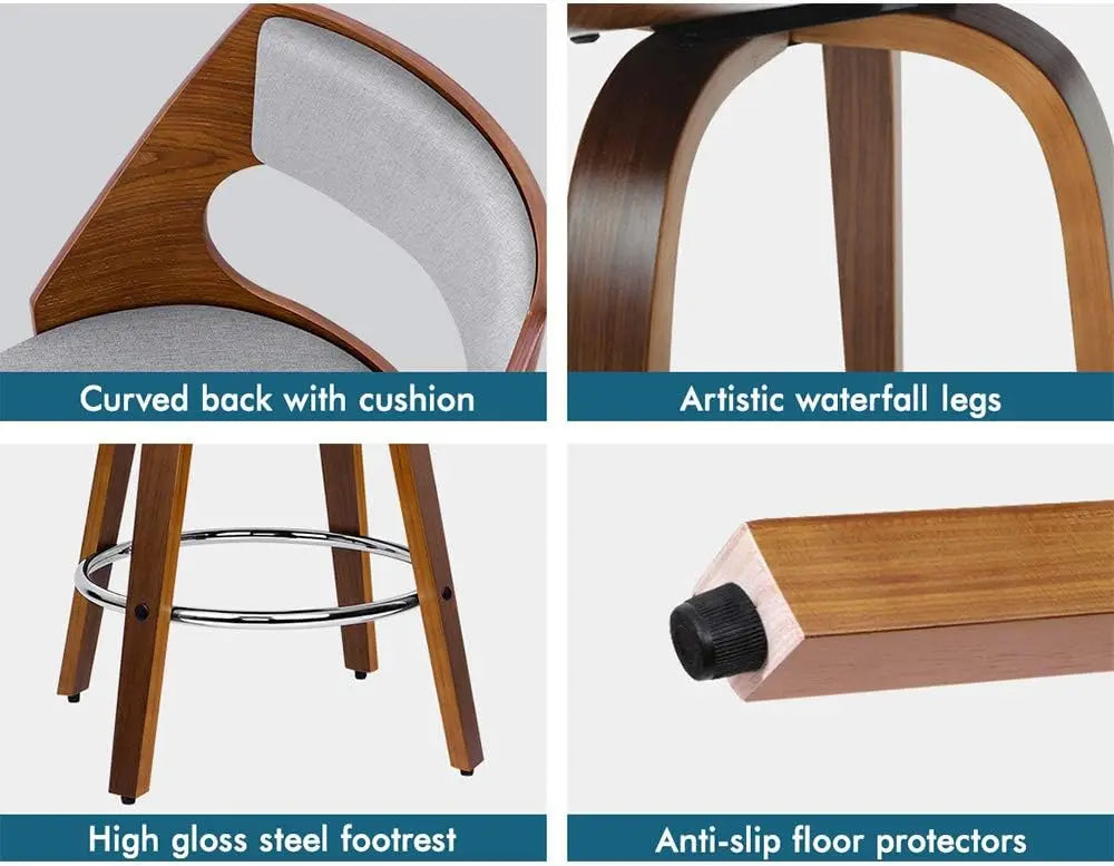 Built with a solid plywood frame showcasing a fine wood grain, these stools feature artistic waterfall-style legs and a polished chrome footrest. A smooth 360° swivel mechanism ensures ease of movement, while anti-slip floor protectors keep the stools stable and secure.