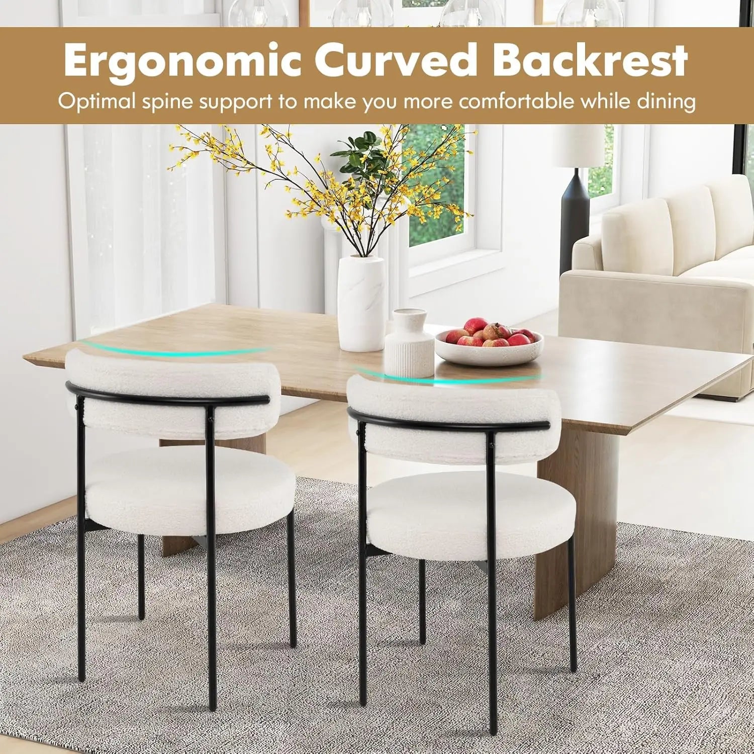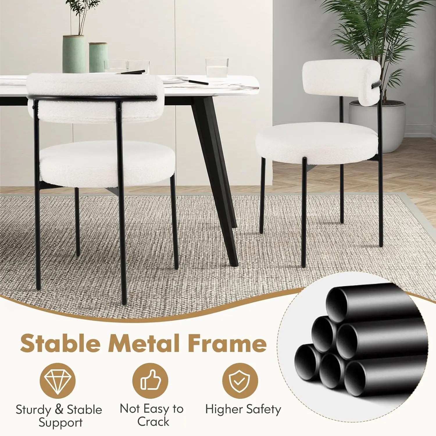 Bring warmth and texture to your dining space with this set of four round dining chairs. Upholstered in soft faux sherpa bouclé with a gently curved backrest, each chair is designed to provide both support and style. The padded sponge seat ensures lasting comfort, making long dinners and gatherings a delight.