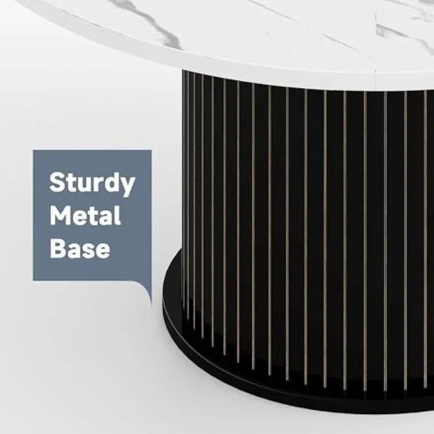 Constructed with a sturdy MDF tabletop and supported by a chic T-shaped metal base with a fluted central pedestal accented by wooden strips, this table combines durability with a sophisticated design. The water-resistant and scratch-proof surface ensures easy cleaning and long-lasting beauty. Simple assembly is made easy with detailed instructions and all necessary tools included.